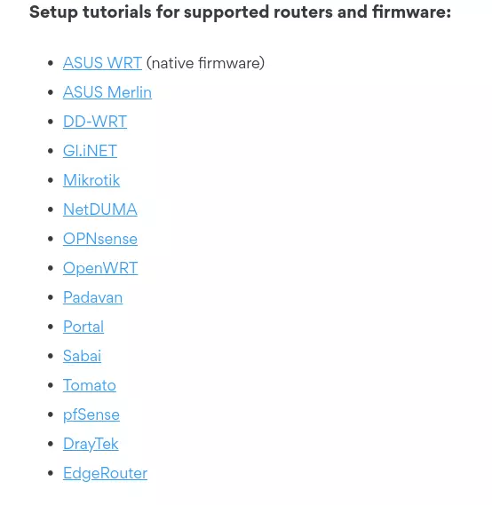 如果您的路由器已经有相关固件,那就太好了!您所要做的就是将 VPN 加载到您的路由器上。幸运的是,本文提到的所有提供商都提供了如何按品牌或固件将 VPN 加载到路由器上的详细说明。 NordVPN 按固件类型划分: