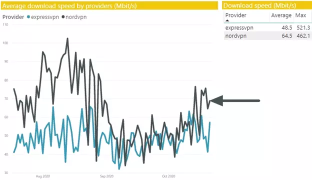 仔细观察图像表明,在整个9月,两个VPN的表现都非常相似。而且似乎很公平地指出,Nord的平均值略微偏向于八月在八月经历的非同寻常的高点。尽管如此,NORDVPN确实以平均下载速度赢得了胜利。