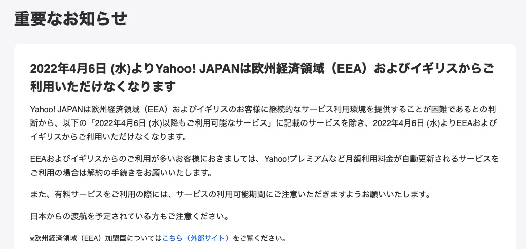 雅虎! JAPAN 在日本拥有大量用户,包括其运营的服务,但从 2022 年 4 月 6 日起,将不再从欧洲经济区 (EEA) 和英国提供服务。