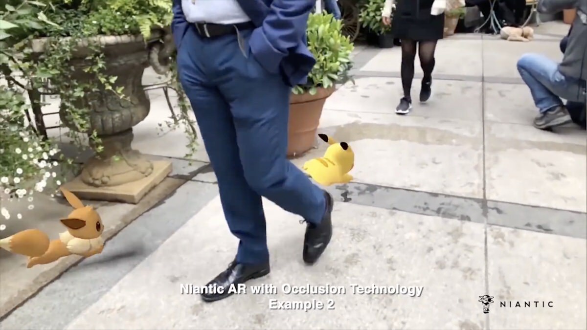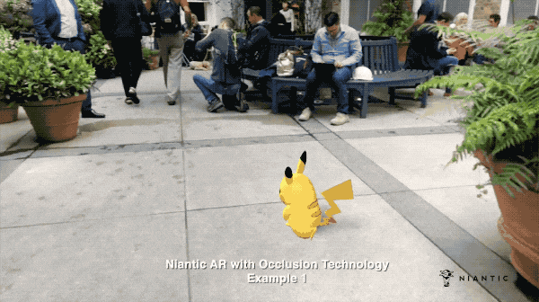 为了让人们了解这个平台是什么样的,Niantic 发布了一个演示,其中皮卡丘在日常场景中奔跑。在普通的 AR 中,皮卡丘是与人和物体重叠的,但在 Niantic Real World Platform 中,机器学习计算皮卡丘与人和物体之间的位置关系,图像显示皮卡丘包裹在人和物体周围。