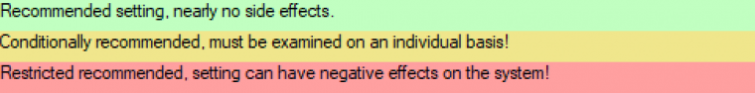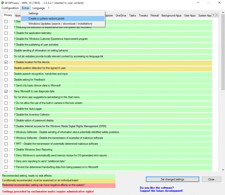W10Privacy 引以為傲的是,可以根據對系統的副作用來訪問所有顏色編碼建議的操作。使用交通燈結構,綠色意味著用戶可以更改設置,除了失去選項的直接功能之外幾乎沒有明顯的影響。有條件地建議使用黃色或琥珀色,要求用戶在確認任何更改之前先查看他們要更改的選項。受限制的推薦設置以紅色突出顯示,如果更改其默認狀態,可能會對系統產生負面影響。