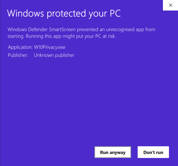 Windows Defender 經常將 W10Privacy 標記為不安全並提示您取消下載。這是一個虛假信號,因為 W10Privacy 完全無害。只需單擊“更多信息”即可顯示“運行”按鈕。