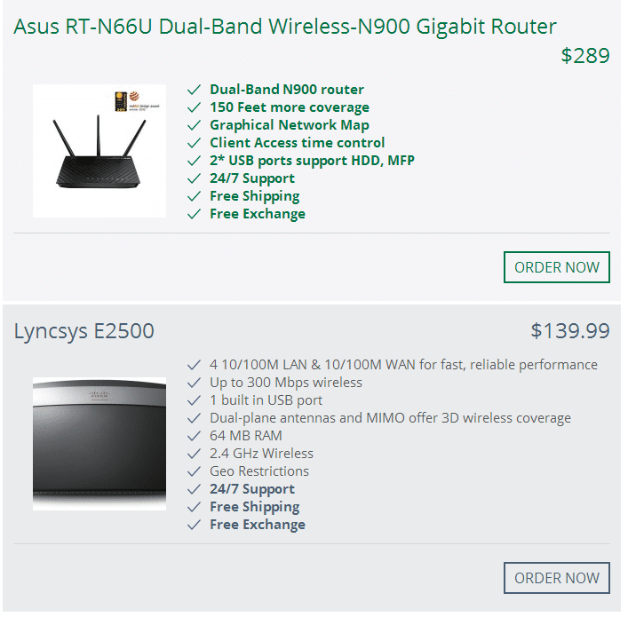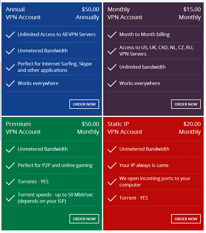VPN土地有三個主要包裹。其中,年度包裝的價格合理,在價格範圍的中間,但他們的其他服務非常昂貴,尤其是他們的高級帳戶。他們還提供了兩個不同的路由器,在它們上出售了DD-WRT和VPN,價格合理。如果您閱讀了他們的TOS,尤其是第26點,您將能夠要求價值10美元的信用。